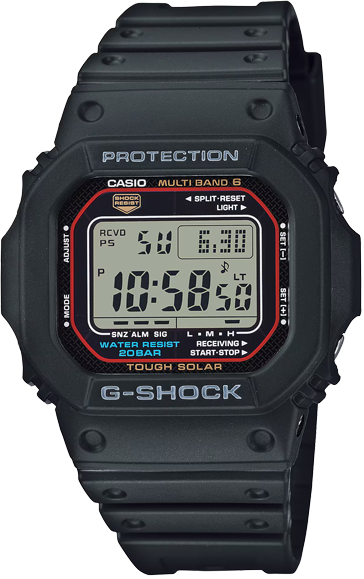 | Features | Incandescent Backlight Battery Powered Tire-Pattern Resin Strap | LED Backlight Tough Solar Multi-Band 6 Radio Timekeeping 5600-Series Resin Strap | LED Backlight Battery Powered Tire-Pattern Resin Strap | LED Backlight Battery Powered 5600-Series Resin Strap |